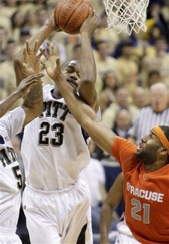 Pittsburgh's Sam Young, left, gets a rebound in front of Syracuse's Arinze Onuaku in the second half of an NCAA college basketball game in Pittsburgh, Monday, Jan. 19, 2009.