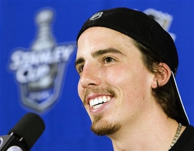In this June 3, 2008 file photo, Pittsburgh Penguins goaltender Marc-Andre Fleury answers questions during a media availability in Pittsburgh. The Pittsburgh Penguins signed Fleury to a seven-year, $35 million dollar contract, the third long-term deal inked with one of their younger players in two days. 'He is extremely gratified to be part of the Penguins core going forward,' Fleury's agent Allan Walsh told The Associated Press on Thursday July 3, 2008.