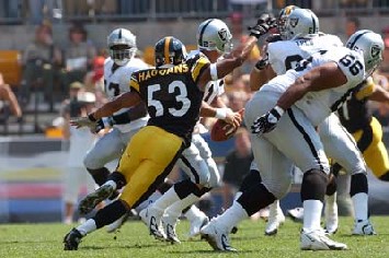 Haggans, the outside linebacker who plays opposite Pro Bowl linebacker Joey Porter in the Steelers’ 3-4 scheme, had a sack, two forced fumbles and 12 tackles, nine solo, against New England. Haggans is tied for the team lead with three sacks in three games.
