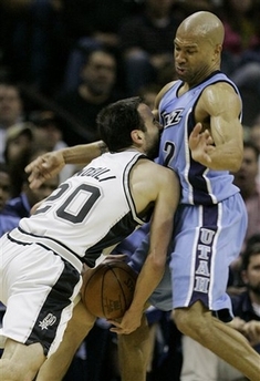 San Antonio Spurs guard Manu Ginobili (20), of Argentina, crashes into Utah Jazz guard Derek Fisher (2) during the first quarter of their Western Conference Finals NBA basketball game in San Antonio, Tuesday, May 22, 2007. (AP Photo/Eric Gay) |