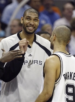 San Antonio Spurs forward Tim Duncan, left, celebrates with teammate guard Tony Parker, of France, the team's NBA basketball first-round playoff game win over the Denver Nuggets in San Antonio, Wednesday, May 2, 2007. San Antonio won 93-78 and will advance to the Western Conference semi-finals. (AP Photo/Eric Gay) |