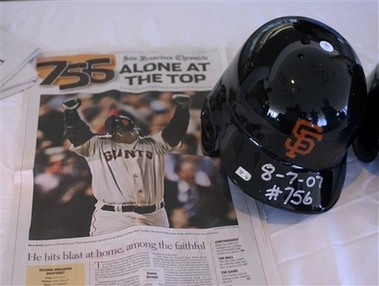 A batting helmet worn by Barry Bonds during his 756th home run, along with a page from the San Francisco Chronicle, is displayed at Albany International Airport in Colonie, N.Y., as it is transported to the National Baseball Hall of Fame and Museum on Thursday, Aug. 9, 2007. The items will be placed on display at the museum in Cooperstown, N.Y., on Friday. (AP Photo/Tim Roske) |