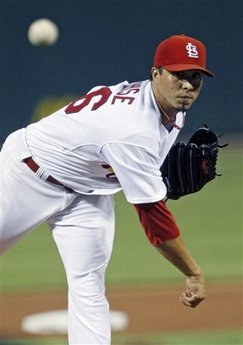 St. Louis Cardinals' Kyle Lohse follows through on a delivery in the first inning against the Arizona Diamondbacks in a baseball game, Tuesday, Sept. 23, 2008, in St. Louis.