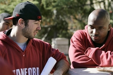 Stanford football players Nick Sanchez, left, and Mark Bradford talk about the firing of football coach Walt Harris on the university's campus in Stanford, Calif., Monday, Dec. 4, 2006.(AP Photo/Marcio Jose Sanchez) |