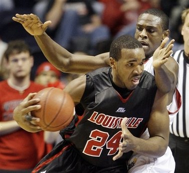 Louisville's Samardo Samuels (24) tries to drive past Western Kentucky's Steffphon Pettigrew in the first half of an NCAA college basketball game in Nashville, Tenn., Sunday, Nov. 30, 2008.
