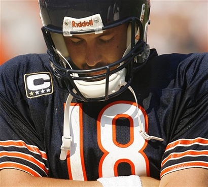 Chicago Bears quarterback Kyle Orton looks down on the sideline during the fourth quarter of an NFL football game against the Tampa Bay Buccaneers, Sunday, Sept. 21, 2008, in Chicago. The Buccaneers won 27-24.(AP) |