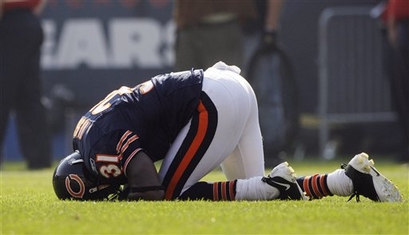Chicago Bears' Nathan Vasher lies on the ground after bringing down Tampa Bay Buccaneers' Antonio Bryant after a 38-yard reception in overtime that set up the winning field goal in an NFL football game Sunday, Sept. 21, 2008, in Chicago. The Bucs defeated the Bears 27-24.(AP) |