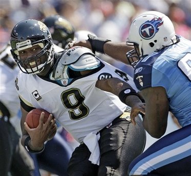 Jacksonville Jaguars quarterback David Garrard (9) tries to get away from the grasp of Tennessee Titans defensive tackle Tony Brown, right, in the first quarter of an NFL football game in Nashville, Tenn., Sunday, Sept. 7, 2008.