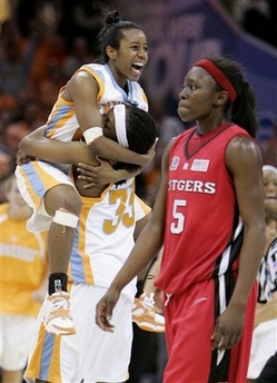 Tennessee's Alberta Auguste (33) hoists up teammate Shannon Bobbitt as Rutgers' Essence Carson walks by after the NCAA Women's national championship college basketball game Tuesday, April 3, 2007 in Cleveland. Tennessee defeated Rutgers 59-46. (AP Photo/Mark Duncan) |
