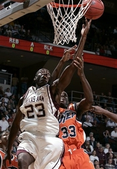 Texas A&M's Josh Carter (23) shoots while guarded by Texas-El Paso's Jeremy Sampson during the first half of their basketball game Wednesday, Nov. 14, 2007 at Reed Arena in College Station, Texas. (AP Photo/Paul Zoeller) |
