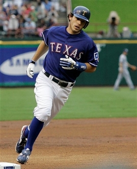 Texas Rangers' Ian Kinsler rounds third on his way home after hitting a solo home run off of Tampa Bay Rays' Edwin Jackson in the first inning of a baseball game, Saturday, Aug. 16, 2008, in Arlington, Texas.