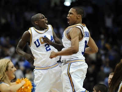 UCLA's Darren Collison, left, and Russell Westbrook celebrate their 77-67 overtime win over Stanford in Los Angeles Thursday, March 6, 2008.