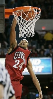 UNLV's Rene Rougeau slams a dunk through the basket during the first half of their NCAA college basketball game against Louisville in Louisville, Ky., Wednesday, Dec. 31, 2008.