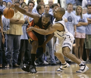 Golden State Warriors' Baron Davis, left, loses the ball as Utah Jazz's Derek Fisher guards him during the fourth quarter of an NBA second-round playoff basketball game Wednesday, May 9, 2007, in Salt Lake City. The Jazz won 127-117 in overtime, taking a 2-0 lead in the series. (AP Photo/Jeff Chiu) |