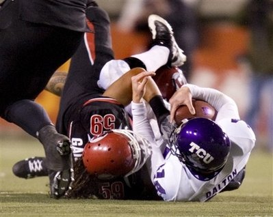 TCU quarterback Andy Dalton (14) is sacked by Utah linebacker Kepa Gaison (59) for a seven-yard loss during the second quarter of the NCAA college football game Thursday, Nov. 6, 2008, in Salt Lake City.