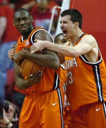 Virginia's Jason Cain, right, reacts after Tunji Soroye drew a foul against Maryland in the final seconds of a basketball game Tuesday, Feb. 6, 2007, in College Park, Md. Virginia won 69-65.