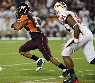 Virginia Tech's Darren Evans (32) runs the ball as Maryland's Mack Frost (91) pursues during the first half of an NCAA college football game in Blacksburg, Va.,Thursday, Nov. 6, 2008.