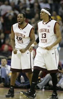Virginia Tech guards Jamon Gordon (22) and Deron Washington (13) reacts after Illinois' Brian Randle (42) missed a jump shot in the final seconds of the game Friday, March 16, 2007, during the first round of the NCAA men's basketball tournament in Columbus, Ohio. Virginia Tech won 54-52. (AP Photo/Tony Dejak) |