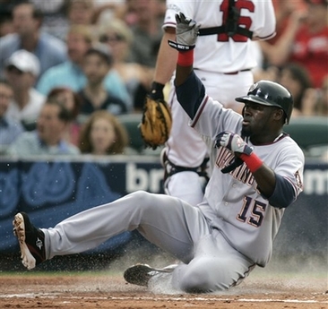 Washington Nationals' Cristian Guzman scores from third base on a Austin Kearns sacrifice fly during the third inning of a baseball game against the Atlanta Braves Saturday, July 19, 2008 in Atlanta. Washington won 8-2.