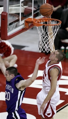 Wisconsin's Jason Bohannon, right, shoots over Northwestern's Craig Moore during the first half of an NCAA college basketball game Wednesday, Jan. 7, 2009, in Madison, Wis. (AP) |