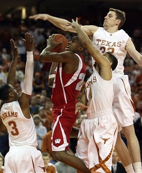 Wisconsin's Michael Flowers attempts to shoot under the heavy defense of Texas' A.J. Abrams (3) D.J. Augustin (14) and Connor Atchley during the first half of a basketball game in Austin, Texas, on Saturday, Dec. 29, 2007.