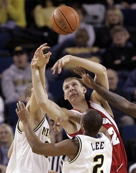 Wisconsin center Brian Butch, center, reaches up for a rebound during the first half of an NCAA college basketball game against Michigan in Ann Arbor, Mich., Wednesday, Jan. 2, 2008.